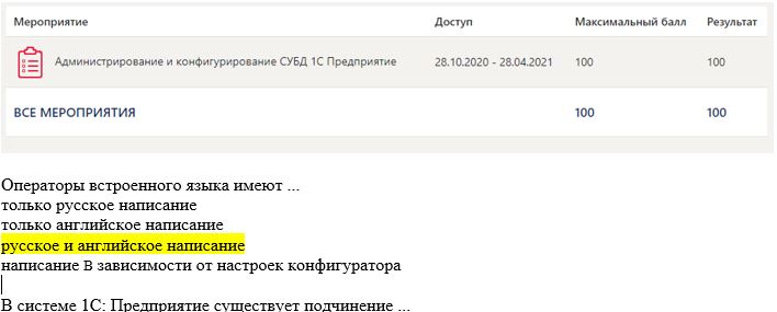 Администрирование и конфигурирование СУБД 1С Предприятие -30 вопросов оценка 100 баллов