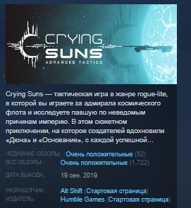 Crying Suns — тактическая игра в жанре rogue-lite, в которой вы играете за адмирала космического флота и исследуете павшую по неведомым причинам империю.
