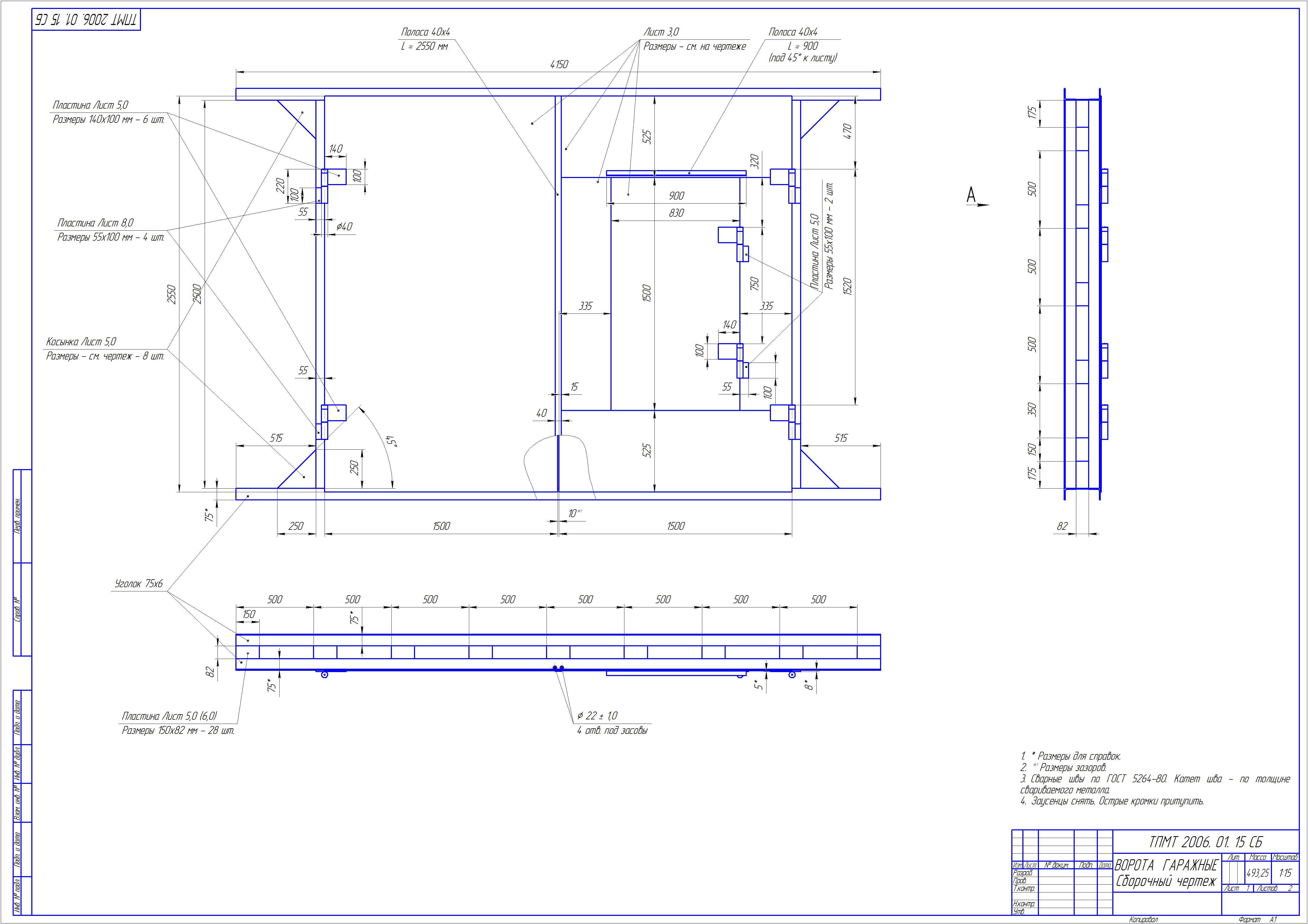 Металлические гаражные ворота с калиткой. Сборочный чертеж с деталировкой. Присутствуют все чертежи