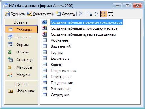 База данных "Спортивный клуб" содержит следующие таблицы: абонемент; клиент; группа; вид занятия; предприятие; подразделение; помещение; сотрудник; должность; расписание.