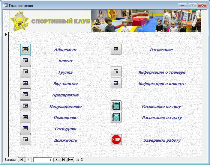 База данных "Спортивный клуб" предназначена для автоматизации проведения мероприятий спортивным клубом «Олимпионик». Позволяет обрабатывать информацию о абонементах, клиентах, группах, видах занятий, предприятии, подразделениях, помещениях, сотрудниках, должностях.