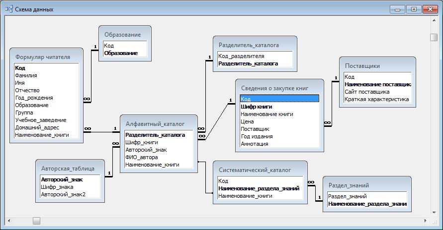 База данных "Библиотека" содержит следующие таблицы: формуляр читателя; алфавитный каталог; систематический каталог; разделитель каталога; раздел знаний; образование; поставщики; сведения о закупке книг.