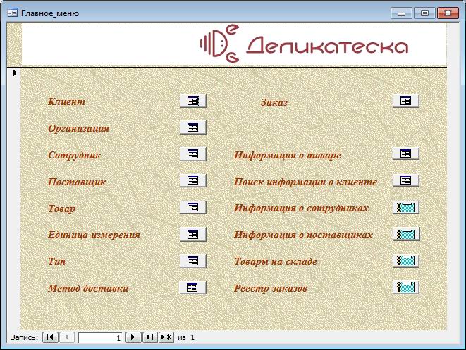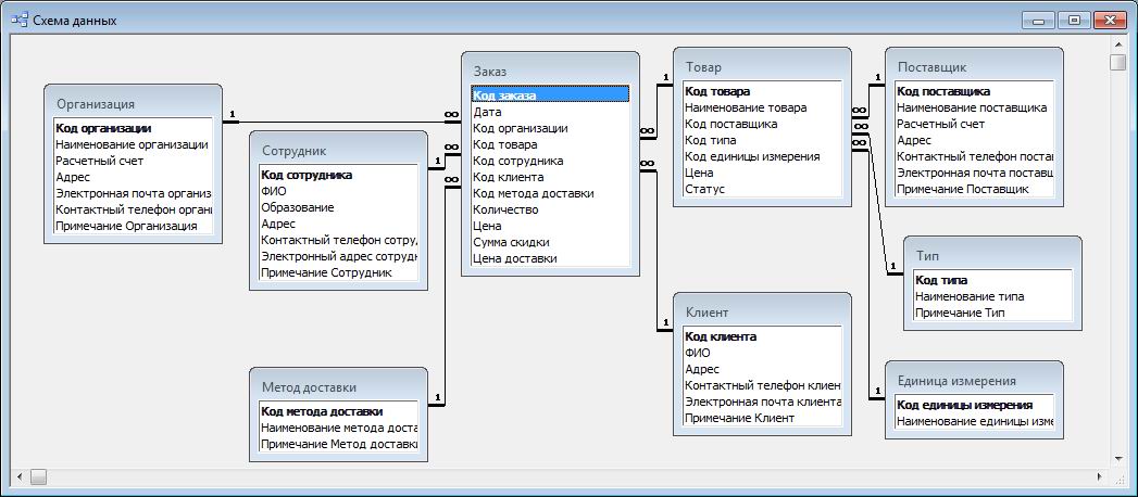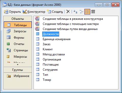 База данных "Магазин продовольственных товаров" содержит следующие таблицы: должность; сотрудник; организация; метод доставки; заказ; товар; клиент; поставщик; тип; единица измерения.