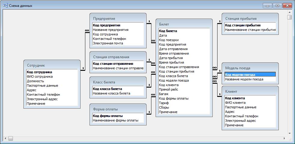 База данных "Касса метрополитена"содержит следующие таблицы: компания; сотрудник; клиент; модель поезда; станция отправления; станция прибытия; класс билета; форма оплаты; билет.