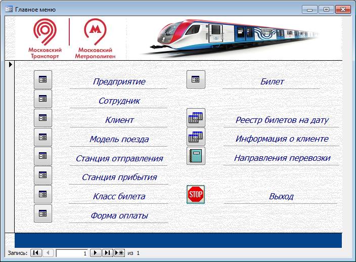 База данных "Касса метрополитена" предназначена для автоматизации работы кассы метрополитена. Позволяет обрабатывать информацию о предприятии, сотрудниках, клиентах, моделях поездов, станциях прибытия, классах билетов, форм оплаты, билетах.