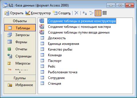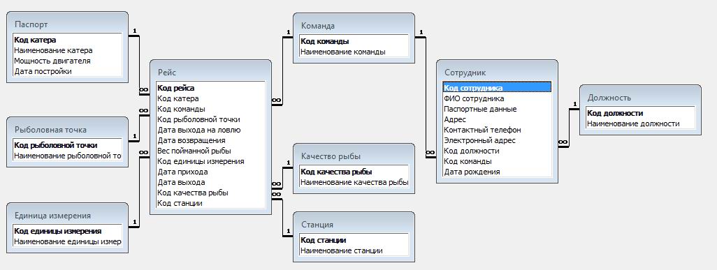База данных "Рыболовная станция" содержит следующие таблицы: должность; сотрудник; команда; паспорт; рейс; станция; единица измерения; качество рыбы; рыболовная точка.