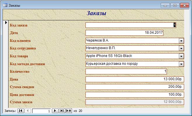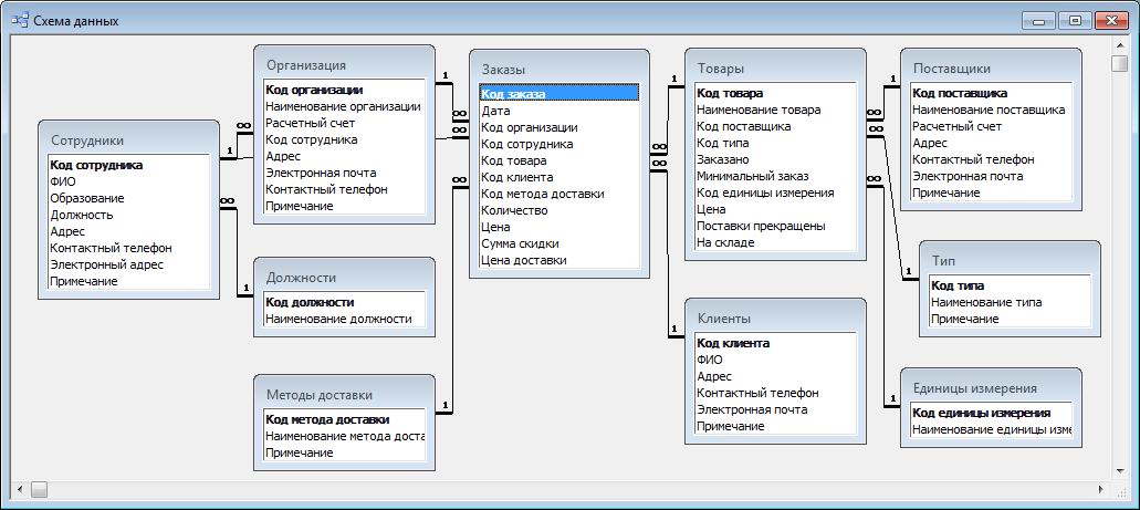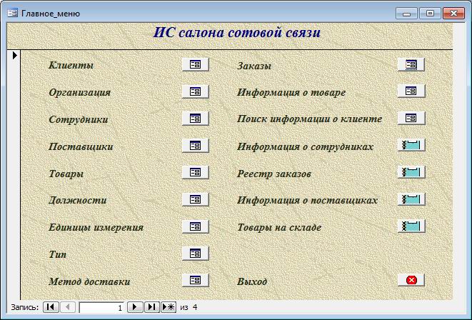 База данных "Салон сотовой связи" содержит следующие таблицы: клиенты; организация; сотрудники; поставщики; товары; должности; единицы измерения; тип; метод доставки; заказы.