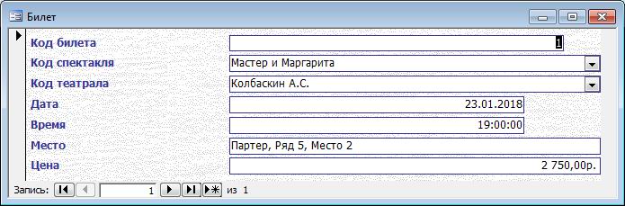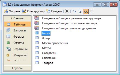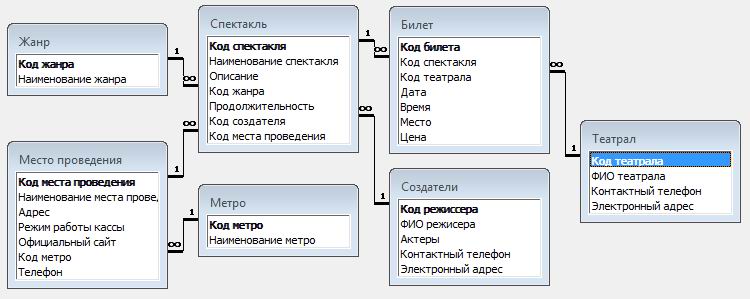 База данных "Театр" содержит следующие таблицы: билет; метро; место проведения; жанр; создатель; спектакль.