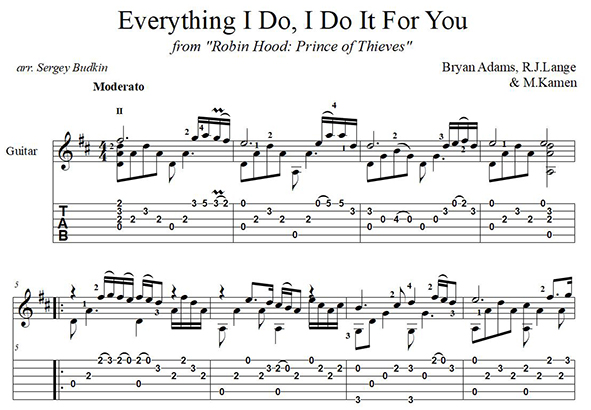 Аранжировка для гитары песни Брайана Адамса из кинофильма "Робин Гуд: Принц воров".