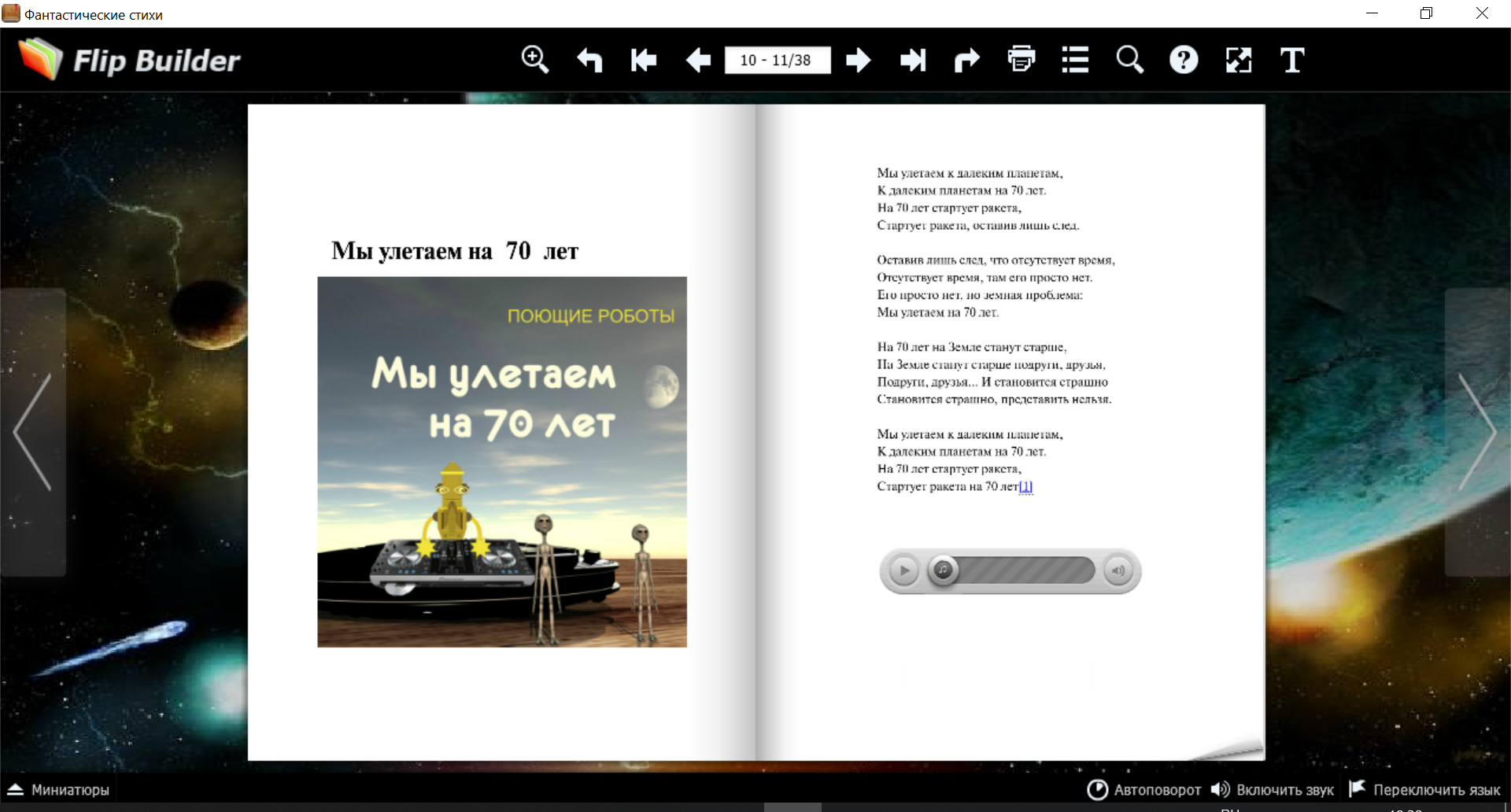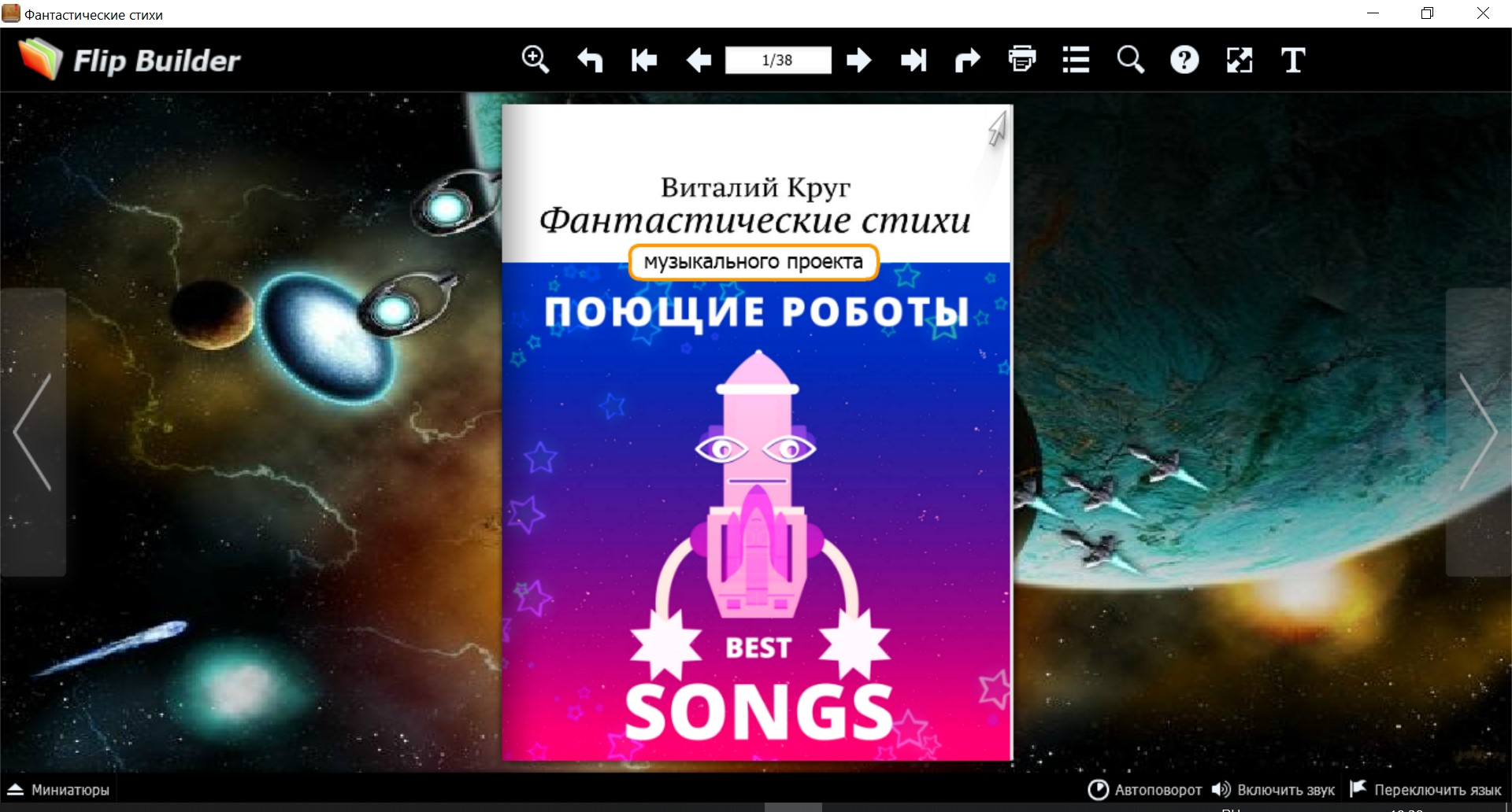 Подарочное Vip-издание: Поющие роботы - Лучшее (тексты, песни) это премиальная красочная электронная книга с переворачивающимися страницами. Для любителей космической, медитативной музыки и стихов на фантастические темы. Стоимость книги вы определяете сами! Если вы тоже автор: музыкант, поэт, художник, то напишите мне и я помогу сделать для вас подобное Vip-издание с вашим творчеством.