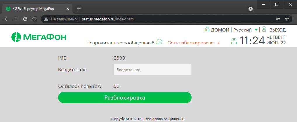 2. Вставьте в устройство SIM карту другого оператора и войдите в web-интерфейс на страницу разблокировки устройства .