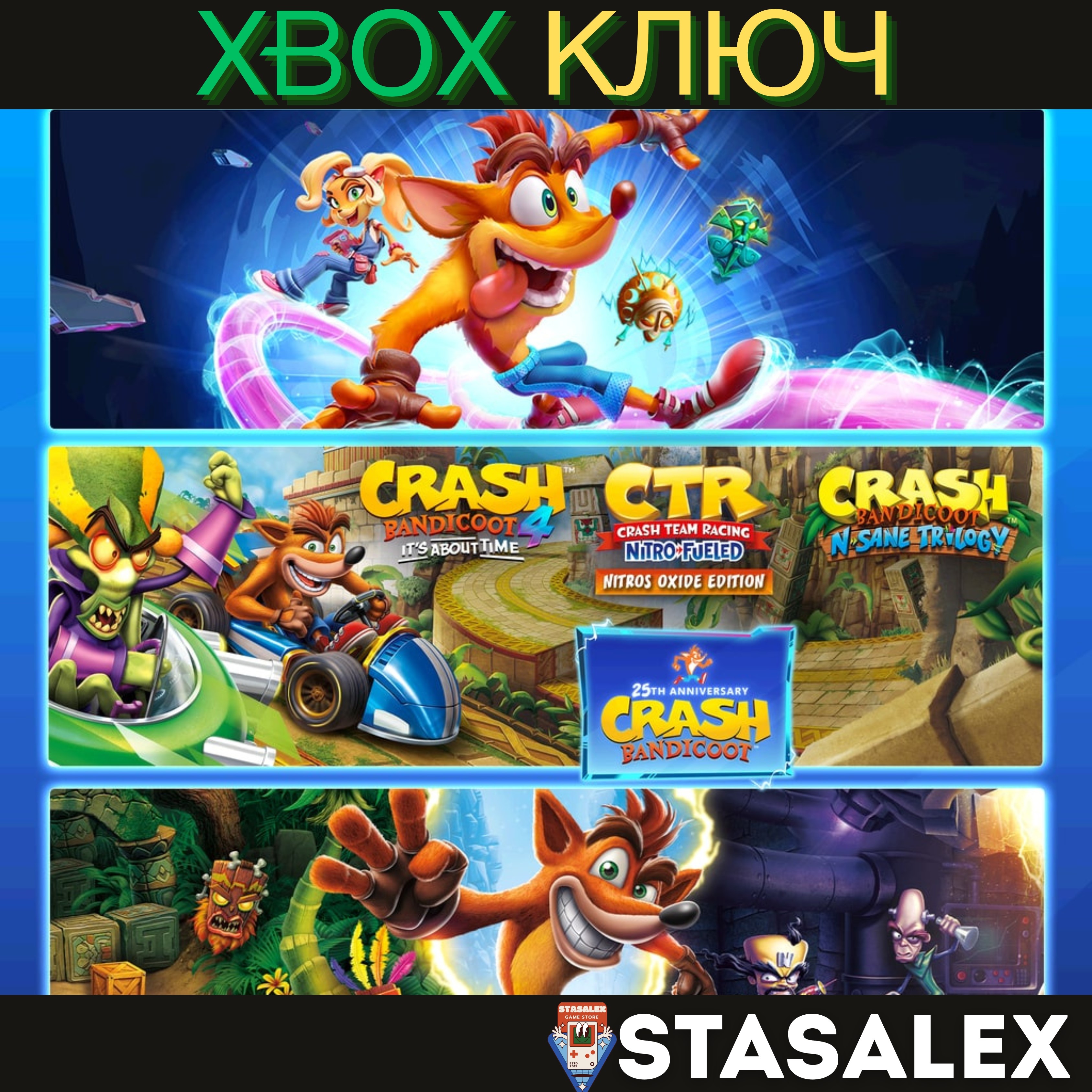 Испытайте четыре игры, полные сумчатого безумия, в этом наборе Crash Bandicoot™, включая N. Sane Trilogy и Crash Bandicoot™ 4: Это вопрос времени.