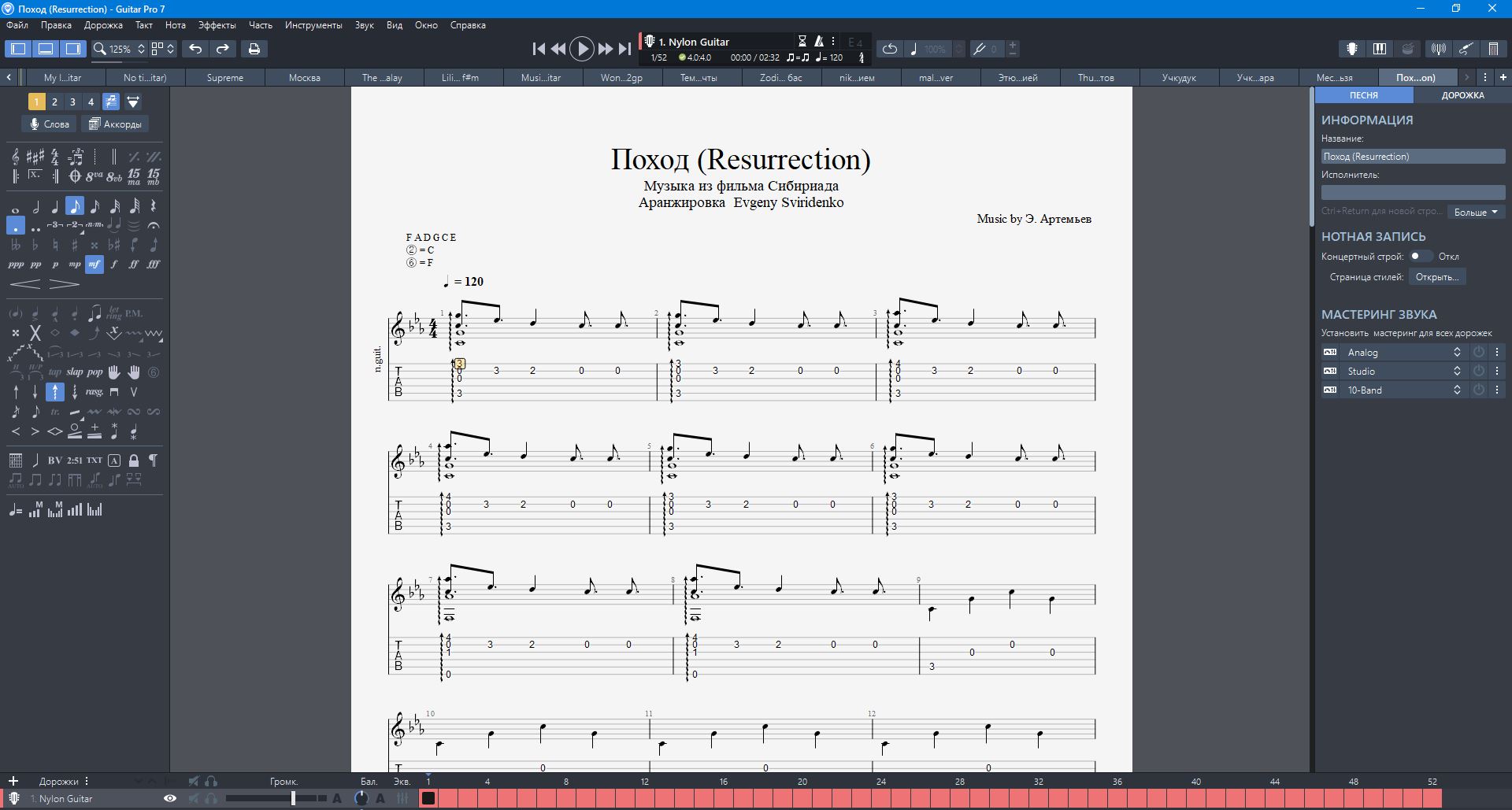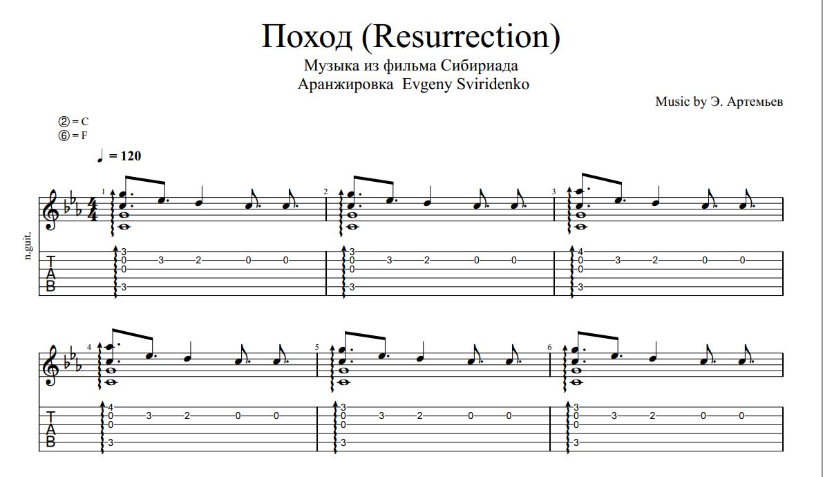 Аранжировка для гитары музыкальной темы "Поход", композитора Эдуарда Артемьева к фильму "Сибириада". Тональность Cm. Строй F-A-D-G-C-E.