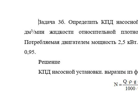 Задача 3б Определить КПД насосной установки. Насос подает 400 дм3/мин жидкости относительной плотности А. Полный напор 30м. Потребляемая двигателем мощность 2,5 кВт. а) А = 0,75, б) А = 0,86, в) А = 0,95.