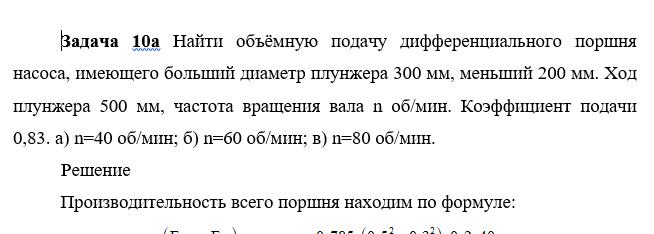 Задача 10а. Найти объёмную подачу дифференциального поршня насоса, имеющего больший диаметр плунжера 300 мм, меньший 200 мм. Ход плунжера 500 мм, частота вращения вала n об/мин. Коэффициент подачи 0,83. а) n=40 об/мин; б) n=60 об/мин; в) n=80 об/мин.