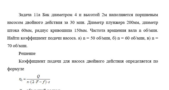 Задача 11а Бак диаметром 4 и высотой 2м наполняется поршневым насосом двойного действия за 30 мин. Диаметр плунжера 200мм, диаметр штока 60мм, радиус кривошипа 150мм. Частота вращения вала n об/мин. Найти коэффициент подачи насоса. а) n = 50 об/мин, б) n = 60 об/мин, в) n = 70 об/мин.