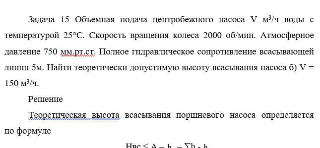 Задача 15б Объемная подача центробежного насоса V м3/ч воды с температурой 25°С. Скорость вращения колеса 2000 об/мин. Атмосферное давление 750 мм.рт.ст. Полное гидравлическое сопротивление всасывающей линии 5м. Найти теоретически допустимую высоту всасывания насоса б) V = 150 м3/ч.