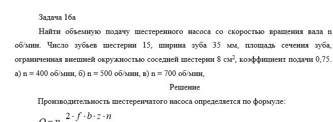 Задача 16а Найти объемную подачу шестеренного насоса со скоростью вращения вала n об/мин. Число зубьев шестерни 15, ширина зуба 35 мм, площадь сечения зуба, ограниченная внешней окружностью соседней шестерни 8 см2, коэффициент подачи 0,75. а) n = 400 об/мин, б) n = 500 об/мин, в) n = 700 об/мин