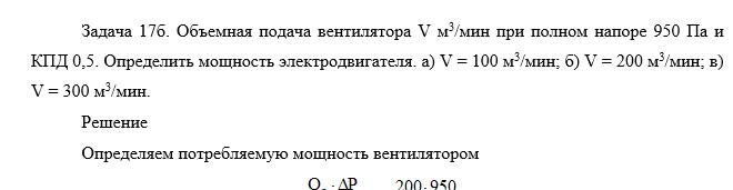 Задача 17б. Объемная подача вентилятора V м3/мин при полном напоре 950 Па и КПД 0,5. Определить мощность электродвигателя. а) V = 100 м3/мин; б) V = 200 м3/мин; в) V = 300 м3/мин.