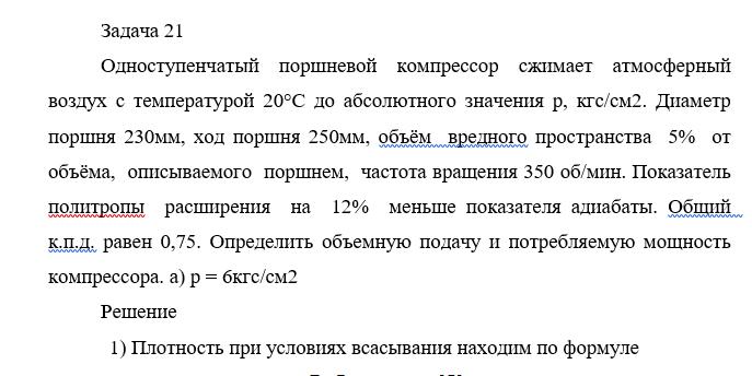 Задача 21а Одноступенчатый поршневой компрессор сжимает атмосферный воздух с температурой 20°С до абсолютного значения р, кгс/см2. Диаметр поршня 230мм, ход поршня 250мм, объём вредного пространства 5% от объёма, описываемого поршнем, частота вращения 350 об/мин. Показатель политропы расширения на 12% меньше показателя адиабаты. Общий к.п.д. равен 0,75. Определить объемную подачу и потребляемую мощность компрессора. а) р = 6кгс/см2