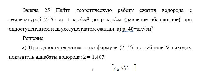 Задача 25а Найти теоретическую работу сжатия водорода с температурой 25°С от 1 кгс/см2 до р кгс/см (давление абсолютное) при одноступенчатом и двухступенчатом сжатии. а) р 40=кгс/см2