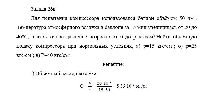 Задала 26в Для испытания компрессора использовался баллон объёмом 50 дм3. Температура атмосферного воздуха в баллоне за 15 мин увеличилась от 20 до 40°С, а избыточное давление возросло от 0 до р кгс/см2.Найти объёмную подачу компрессора при нормальных условиях, а) р=15 кгс/см2; б) р=25 кгс/см2; в) Р=40 кгс/см2.
