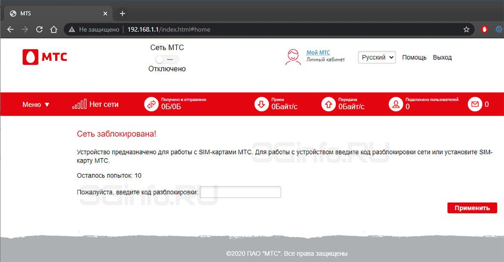 После ввода полученного кода разблокировки в веб-интерфейсе модема - он начинает работать с SIM картами любых операторов.