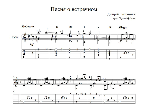 Аранжировка для гитары песни Дмитрия Шостаковича, написанной к кинофильму "Встречный" в 1932 году.