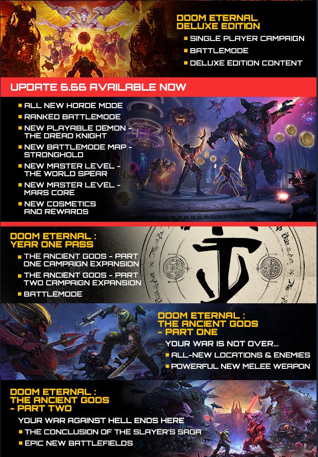 Разгромив армию ада, вы спасли человечество от истребления, но дорогой ценой. В царстве небесном возник дисбаланс сил, и скоро явится настоящий владыка вселенной, чтобы навести порядок. Сражайтесь в новых мирах вселенной DOOM, уничтожайте новых демонов и используйте новые способности в бесконечной битве с силами зла.