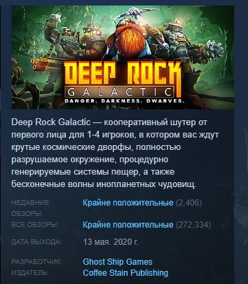 Deep Rock Galactic — первый научно-фантастический шутер с видом от первого лица для совместной игры, в котором вас ждут крутые космические гномы, полностью разрушаемое окружение, процедурно генерируемые системы пещер и бесконечные волны инопланетных чудовищ.