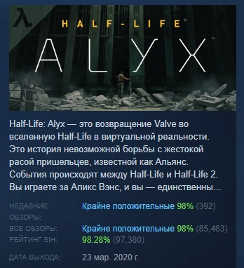 Half-Life: Alyx — это возвращение Valve во вселенную Half-Life в виртуальной реальности. Это история невозможной борьбы с жестокой расой пришельцев, известной как Альянс. События происходят между Half-Life и Half-Life 2.