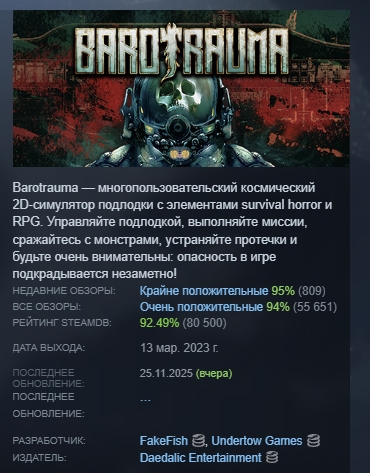 Barotrauma — многопользовательский 2D-симулятор подлодки в жанре survival horror. На его создание повлияли такие игры, как FTL: Faster Than Light, RimWorld, Dwarf Fortress и Space Station 13. Эта научно-фантастическая игра — сочетание физики «тряпичной куклы», инопланетных монстров, обитающих под водой, командной работы и всепоглощающего страха.