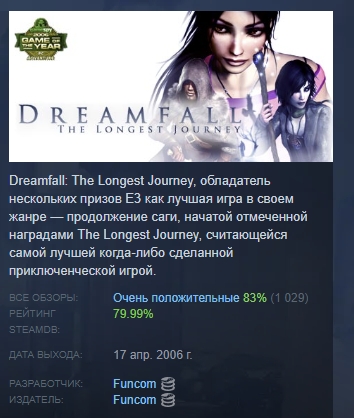 ★ Игра для всех 50% игравших в оригинальную The Longest Journey были женщинами. С его кинематическим подходом, правдоподобными героями, продуманной сюжетной линией и легким для восприятия интерфейсом, Dreamfall — это игра, которую любой подросток или взрослый может принять и полюбить, независимо от их игрового прошлого.