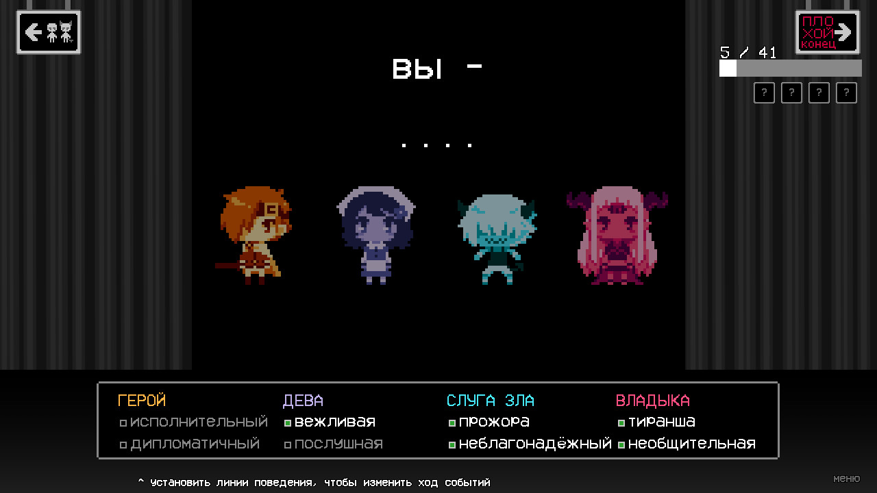 решения, которые вы принимаете в одной истории, повлияют на остальные. вы можете задействовать разные линии поведения, чтобы открывать новые пути! увы, каждый путь ведёт к плохому финалу…
