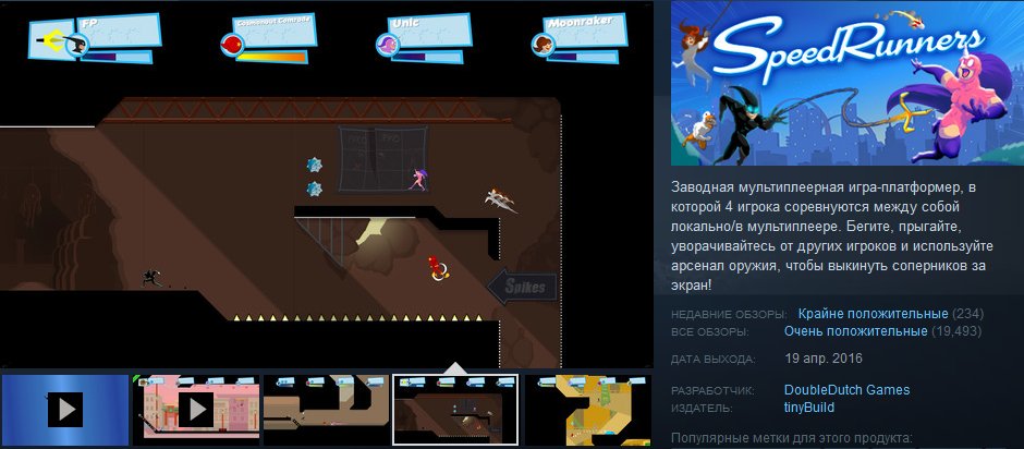 SpeedRunners - соревновательный платформер для 4-х игроков, с крюками-кошками усилениями и интерактивными объектами. Бегите, прыгайте, летайте на крюках, стреляйте ракетами, притягивайте игроков - делайте всё, чтобы они выбыли.