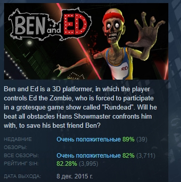 Ben and Ed — это трёхмерный платформер, в котором игрок управляет зомби Эдом, вынужденным участвовать в гротескном игровом шоу под названием «Rundead». Сможет ли он преодолеть все препятствия, которые ему устроит Ханс Шоумастер, чтобы спасти своего лучшего друга Бена?