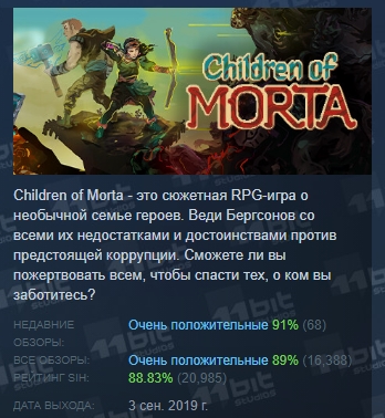 Children of Morta - это сюжетная RPG-игра о необычной семье героев. Веди Бергсонов со всеми их недостатками и достоинствами против предстоящей коррупции. Сможете ли вы пожертвовать всем, чтобы спасти тех, о ком вы заботитесь?