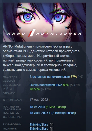 ANNO: Mutationem - приключенческая игра с элементами РПГ, действие которой происходит в киберпанковом мире. Напряжённый сюжет, полный загадочных событий, воплощённый в пиксельной двухмерной и трёхмерной графике, захватывает с самых первых мгновений.