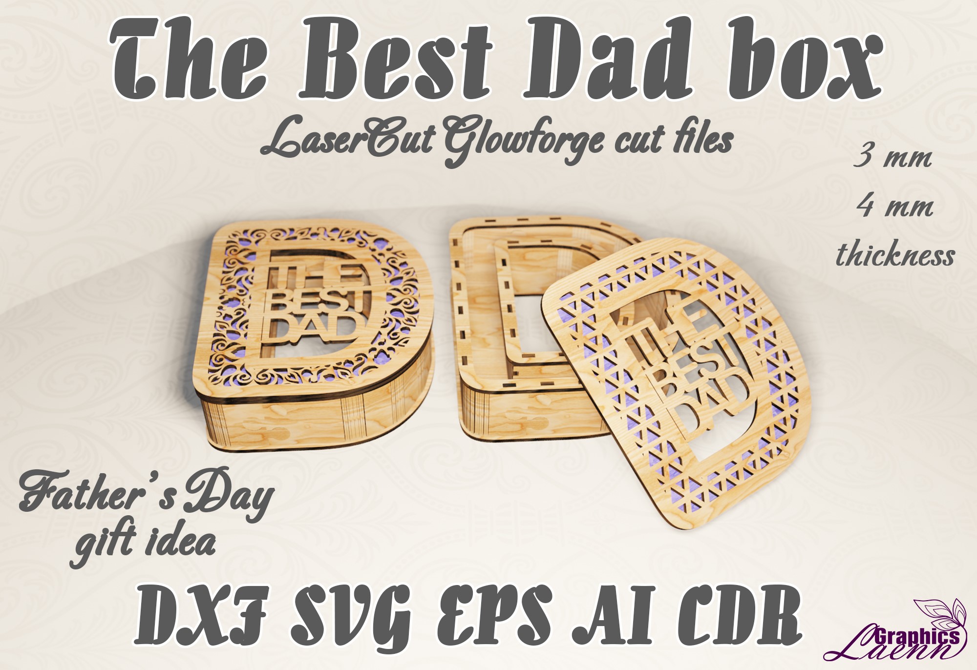 Подарочная шкатулка для папы, макет для лазерной резки, под 3 и 4 мм толщину материала. Это векторный макет для лазерного или фрезерного резака.