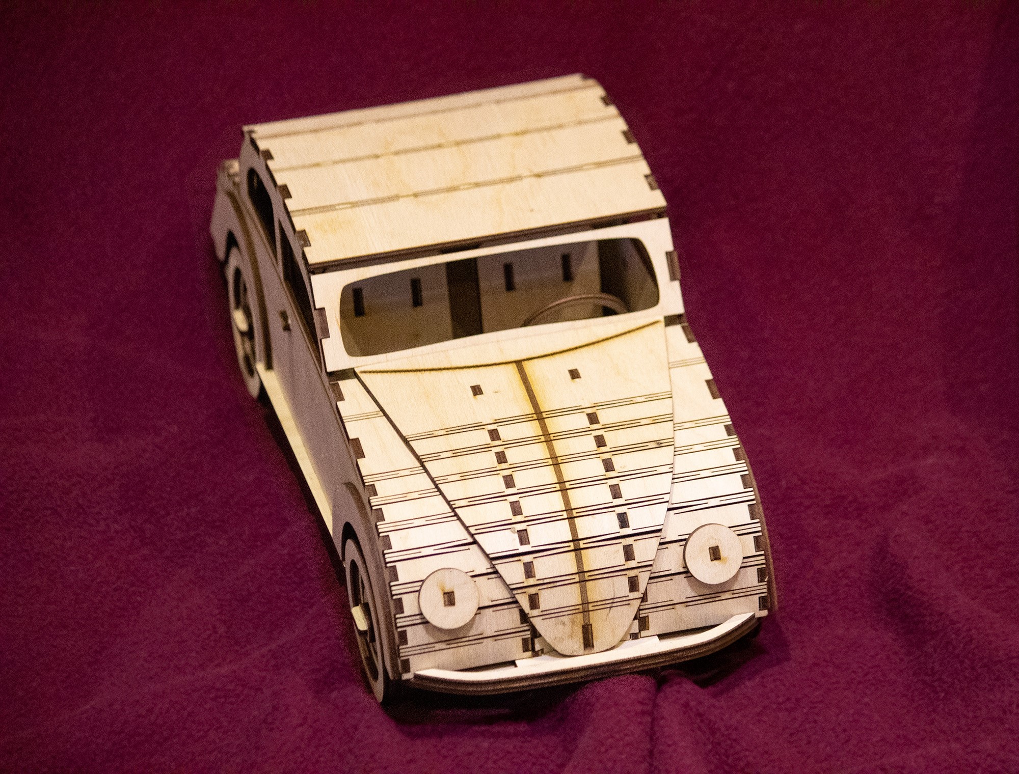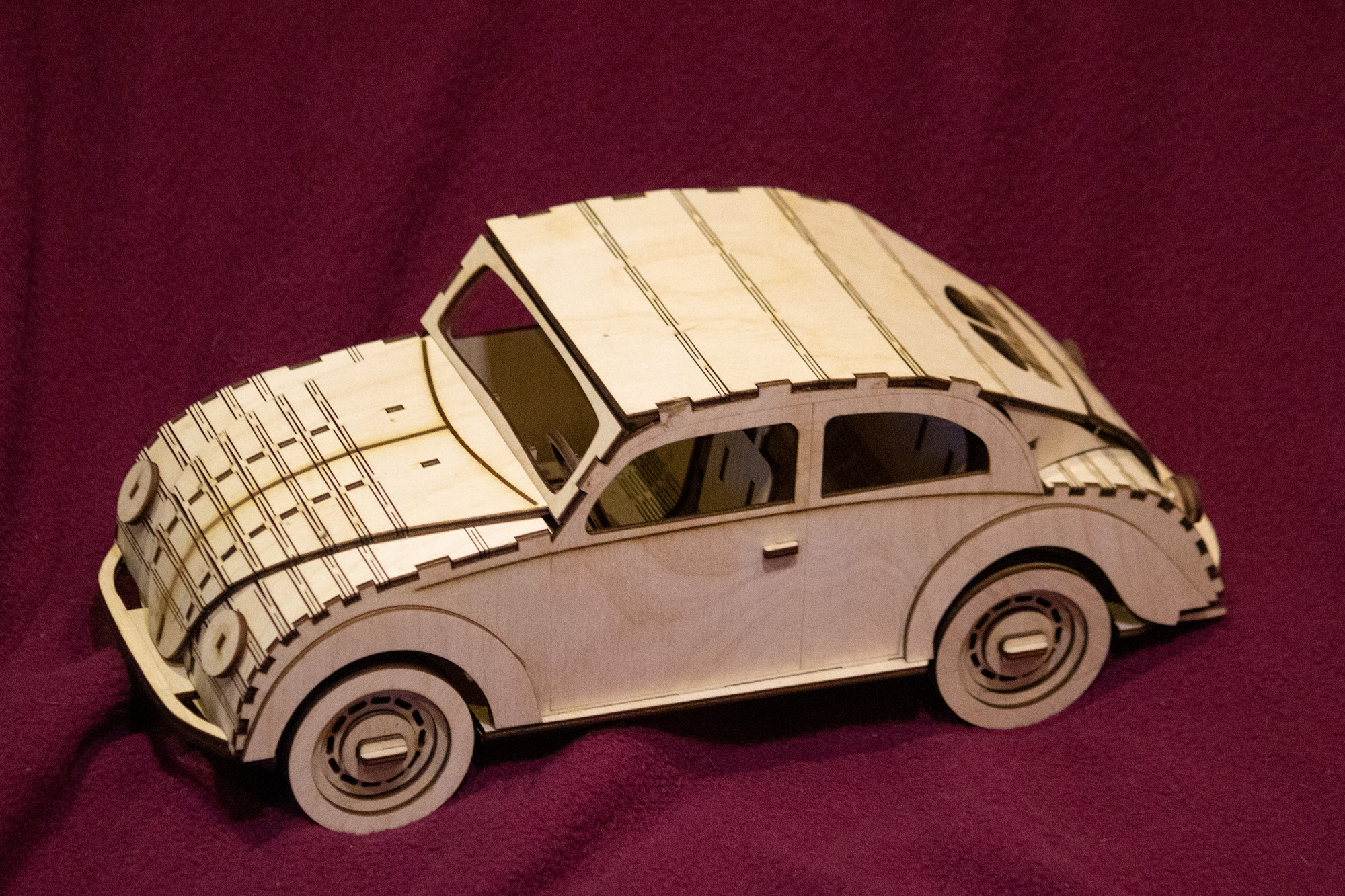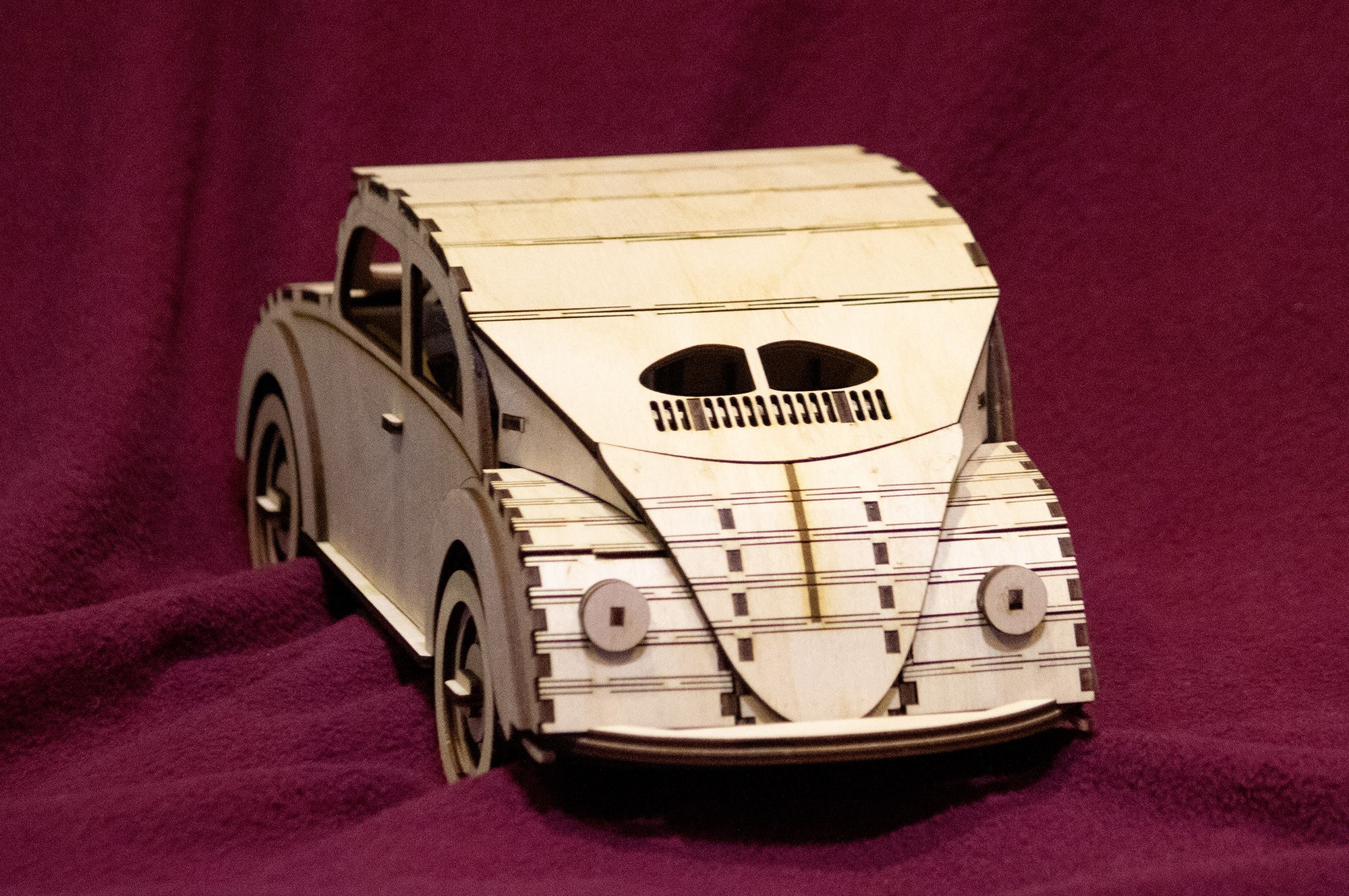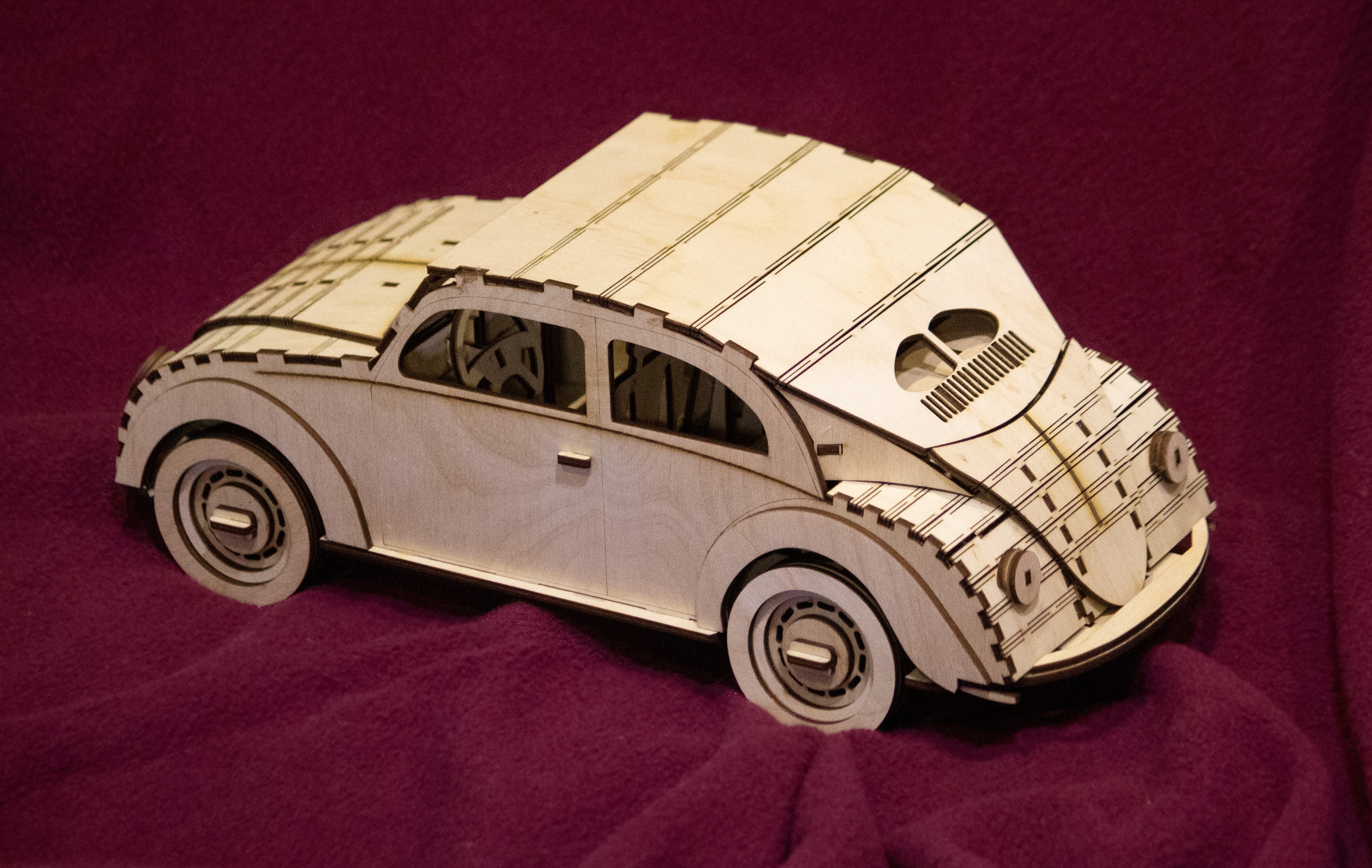 Модель Wolkswagen Beetle, макет для лазерной резки, под 3 мм толщину материала. Это векторный макет для лазерного или фрезерного резака. Данный проект содержит инструкции по сборке.