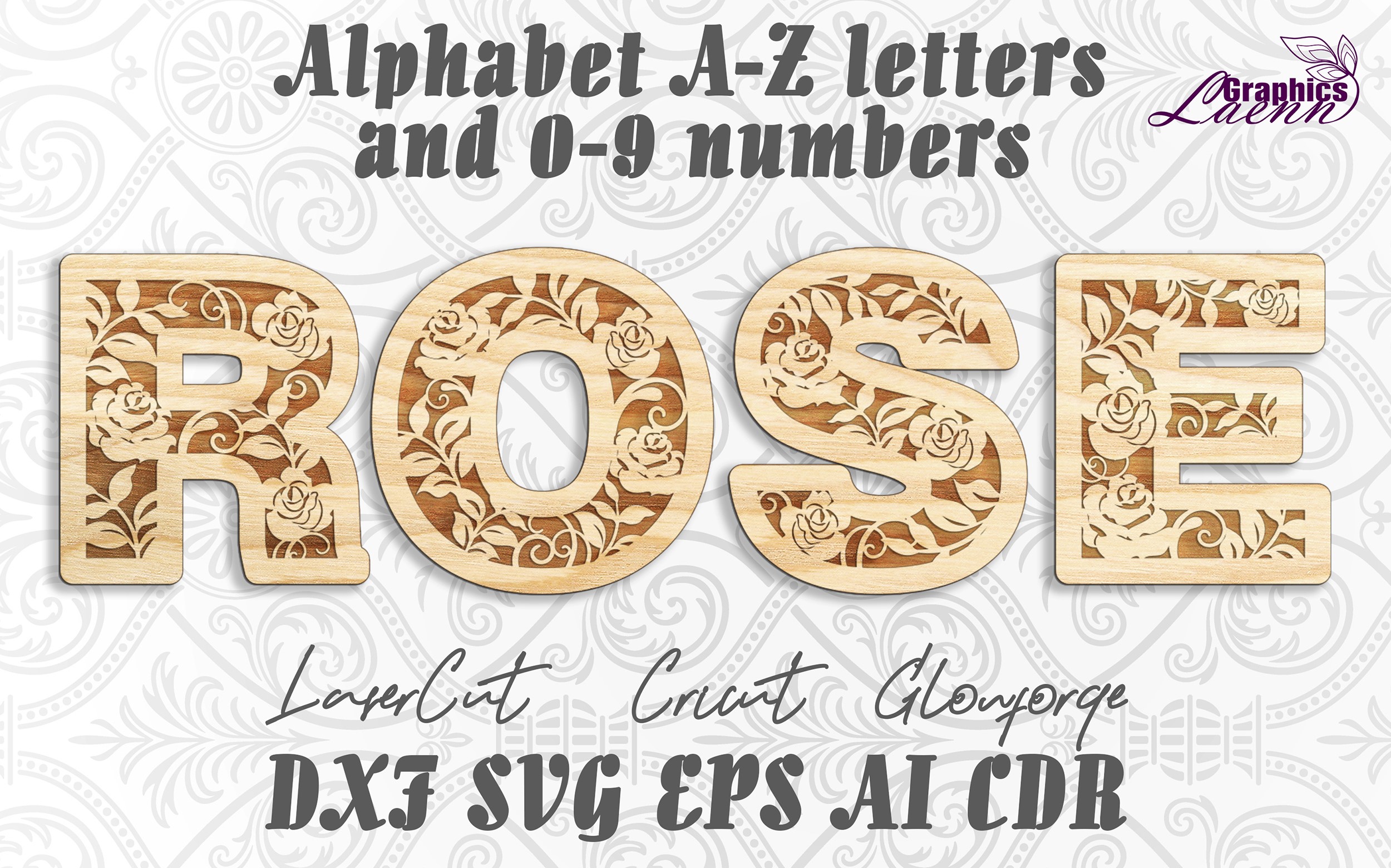 Роза алфавит буквы a-z, цифры 0-9 макет для лазерной резки, под любую толщину материала. Это векторный макет для лазерного или фрезерного резака, glowforge, cricut. Для использования в дизайне и графических программах.