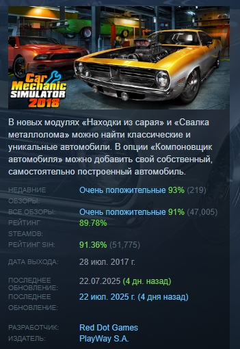 В новых модулях «Находки из сарая» и «Свалка металлолома» можно найти классические и уникальные автомобили. В опции «Компоновщик автомобиля» можно добавить свой собственный, самостоятельно построенный автомобиль. Строй и развивай свою собственную империю ремонтных услуг в этом необыкновенно подробном и реалистическом моделировании, в котором забота о деталях просто удивительная.