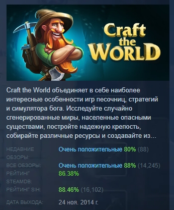Craft the World объединяет в себе наиболее интересные особенности игр песочниц, стратегий и симулятора бога. Исследуйте случайно сгенерированные миры, населенные опасными существами, постройте надежную крепость, собирайте различные ресурсы и создавайте из них все необходимые вам предметы, конструкции и вооружение.