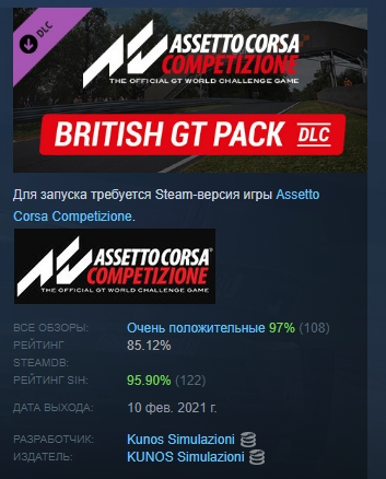 роме того, дополнение BRITISH GT PACK добавляет более 40 новых расцветок и 70 гонщиков из сезона 2019 года, а также специальный сезон чемпионата. Сезон British GT доступен для всех игроков Assetto Corsa Competizione с базовым контентом, а с соответствующим обновлением игры (v1.7) все игроки теперь могут участвовать в гонках смешанного класса в рамках выбора сезона British GT. Три новых британских трека и возможность выбора автомобилей GT4 являются эксклюзивными для обладателей BRITISH GT Pack и GT4 European Series DLC соответственно. Тем не менее, игроки, которые еще не владеют пакетами GT4 European Series и BRITISH GT DLC, могут по-прежнему участвовать в гонках смешанного класса на всех треках с базовым контентом и участвовать в гонках с противниками GT4 на одном треке.