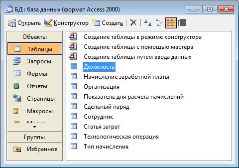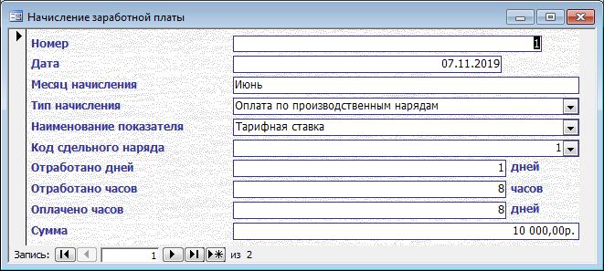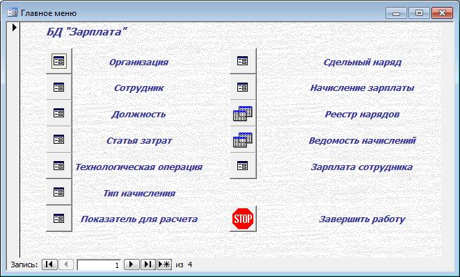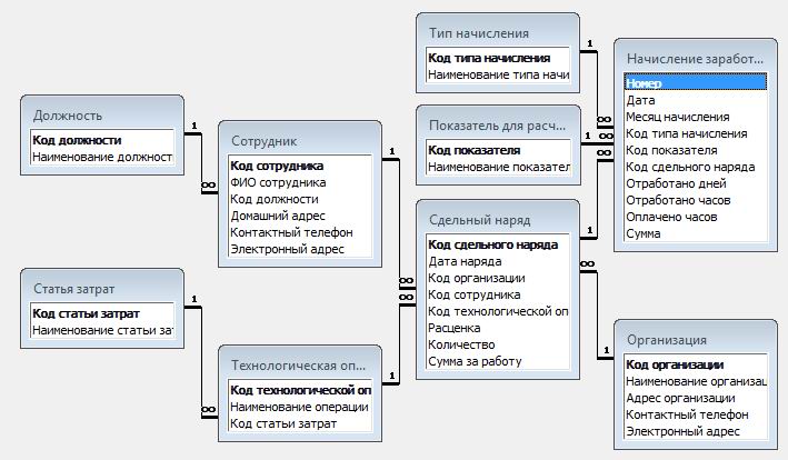 База данных "Зарплата" содержит следующие таблицы: организация; сотрудник; должность; статья затрат; технологическая операция; тип начисления; показатель для расчета; сдельный наряд; начисление зарплаты.