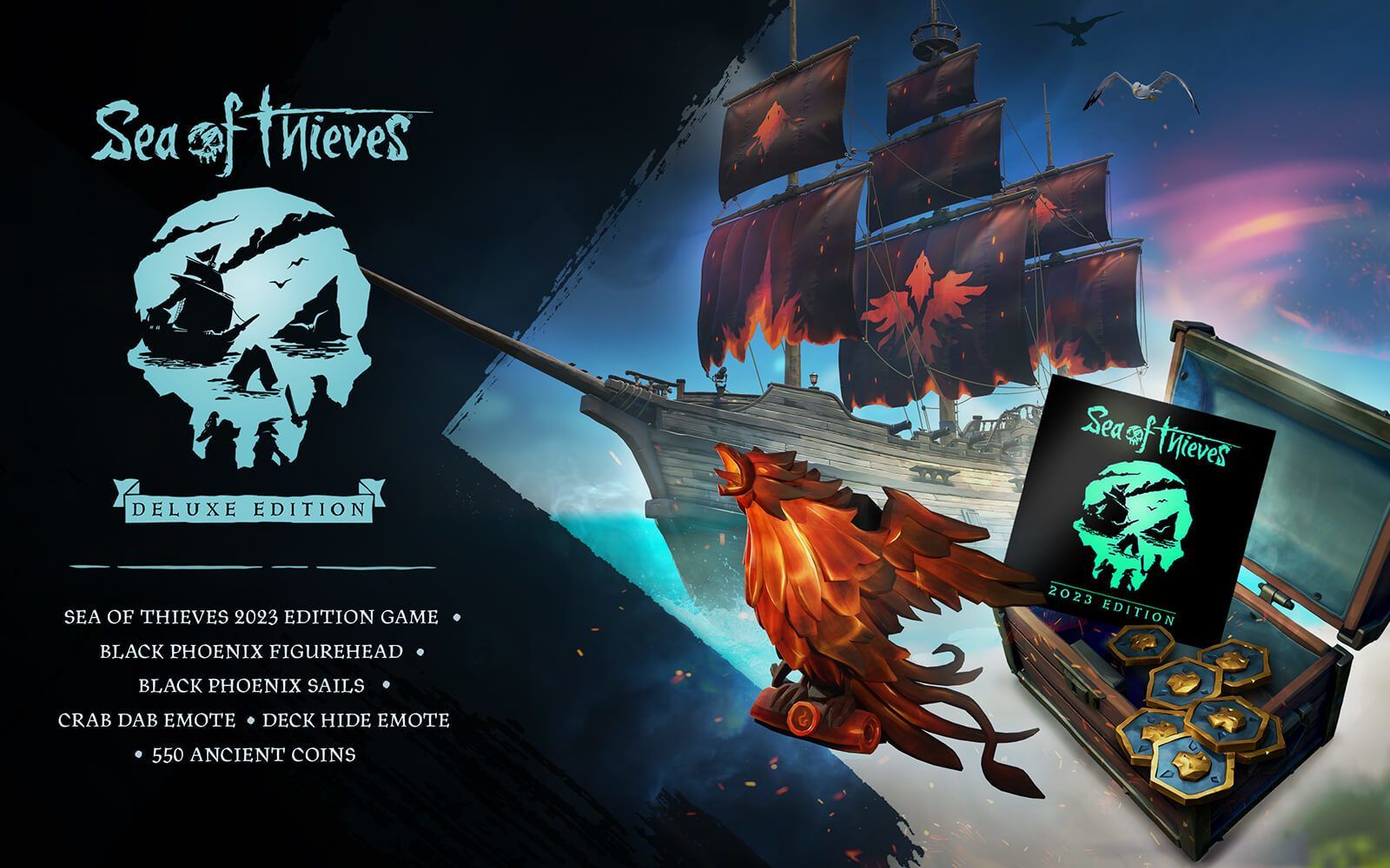 Отпразднуйте пятую годовщину запуска Sea of Thieves с этим специальным изданием, включающим копию игры с постоянным контентом за весь период существования игры, а также множество косметических и коллекционных предметов. Вдобавок к дополнительному контенту издания 2023 (сабля, пистоль, компас, шляпа, камзол и паруса «Охотник», 10000 золота) это издание включает делюксовый набор, в который входят носовая фигура и паруса «Черный феникс», эмоции «Даб клешней» и «Укрытие на палубе» и 550 древних монет, которые можно потратить в пиратской лавке.