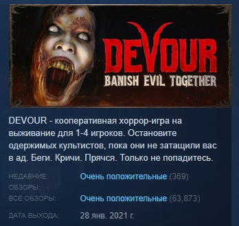 DEVOUR - кооперативная хоррор-игра на выживание для 1-4 игроков. Остановите одержимых культистов, пока они не затащили вас в ад. Беги. Кричи. Прячся. Только не попадитесь.
