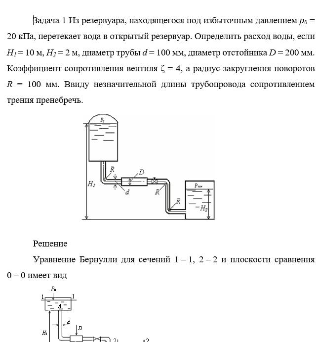 Задача 1 Из резервуара, находящегося под избыточным давлением р0 = 20 кПа, перетекает вода в открытый резервуар. Определить расход воды, если Н1 = 10 м, Н2 = 2 м, диаметр трубы d = 100 мм, диаметр отстойника D = 200 мм. Коэффициент сопротивления вентиля ζ = 4, а радиус закругления поворотов R = 100 мм. Ввиду незначительной длины трубопровода сопротивлением трения пренебречь.