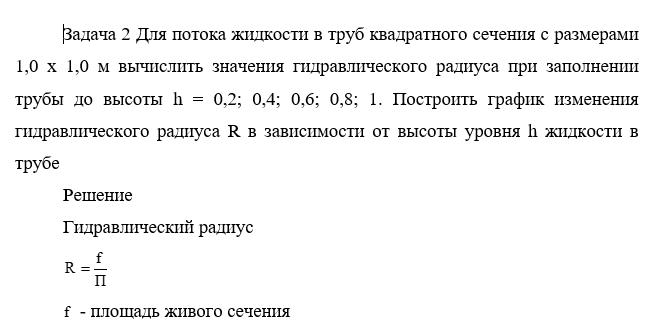 Задача 2 Для потока жидкости в труб квадратного сечения с размерами 1,0 х 1,0 м вычислить значения гидравлического радиуса при заполнении трубы до высоты h = 0,2; 0,4; 0,6; 0,8; 1. Построить график изменения гидравлического радиуса R в зависимости от высоты уровня h жидкости в трубе