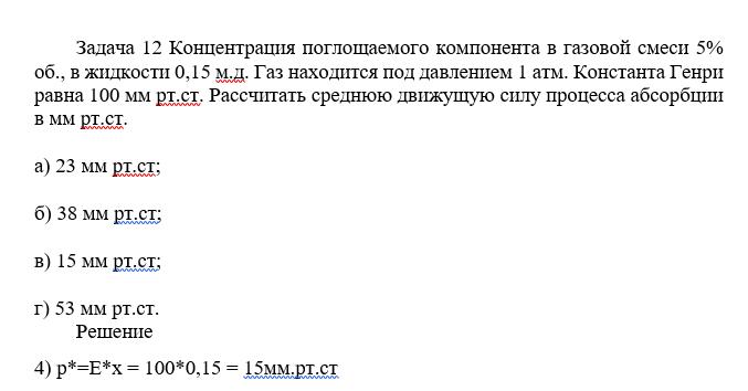 Задача 12 Концентрация поглощаемого компонента в газовой смеси 5% об., в жидкости 0,15 м.д. Газ находится под давлением 1 атм. Константа Генри равна 100 мм рт.ст. Рассчитать среднюю движущую силу процесса абсорбции в мм рт.ст.